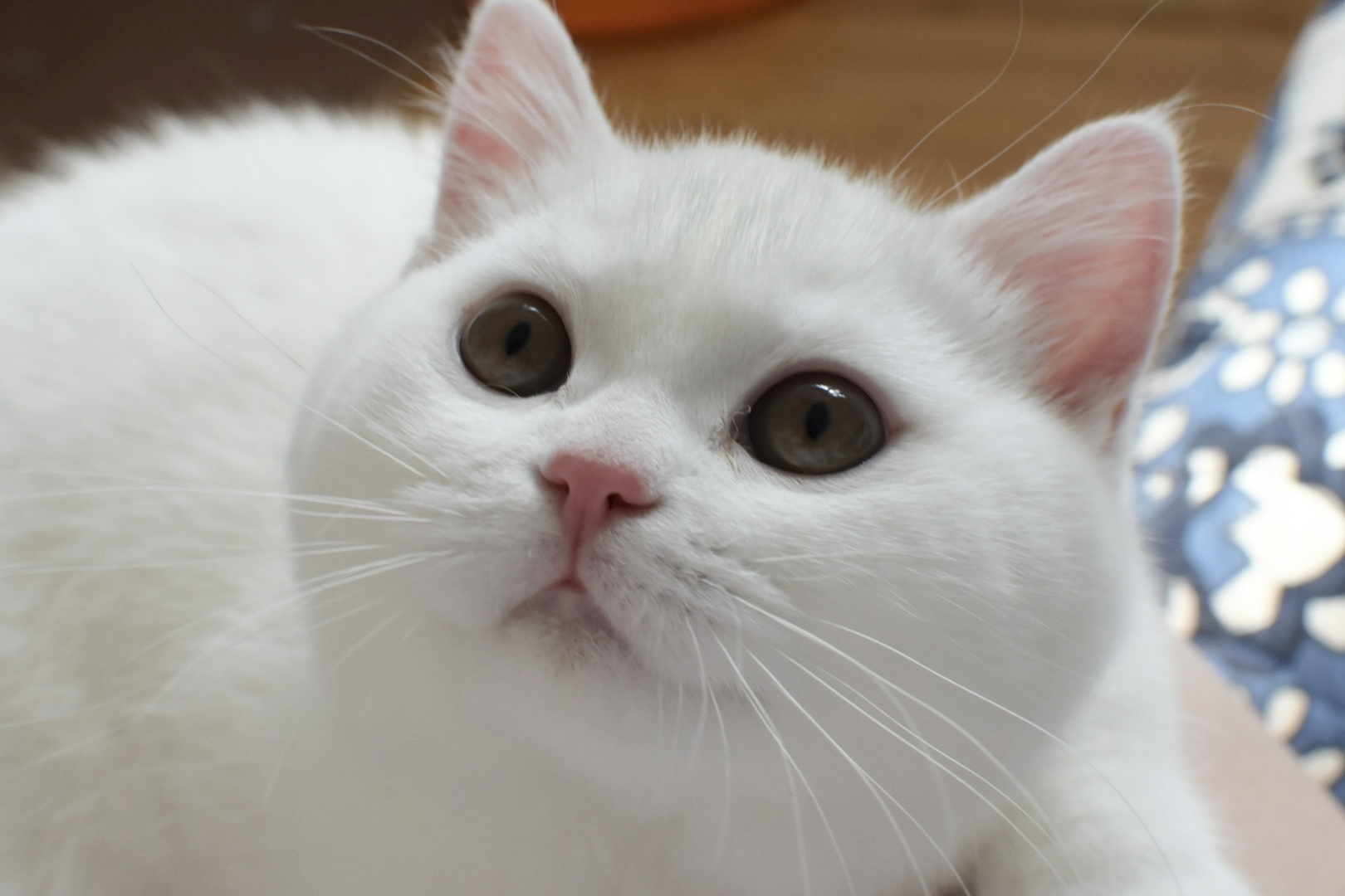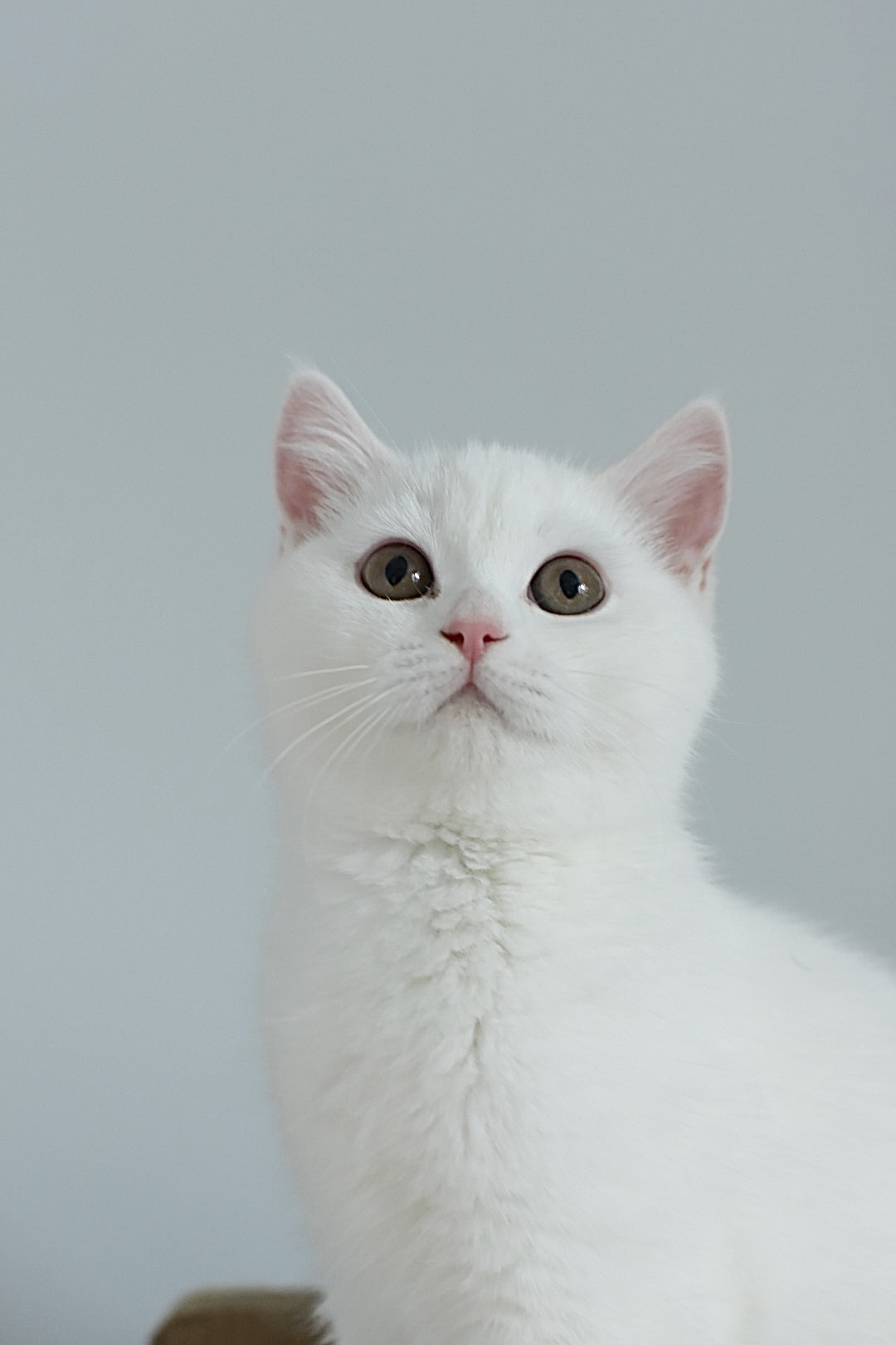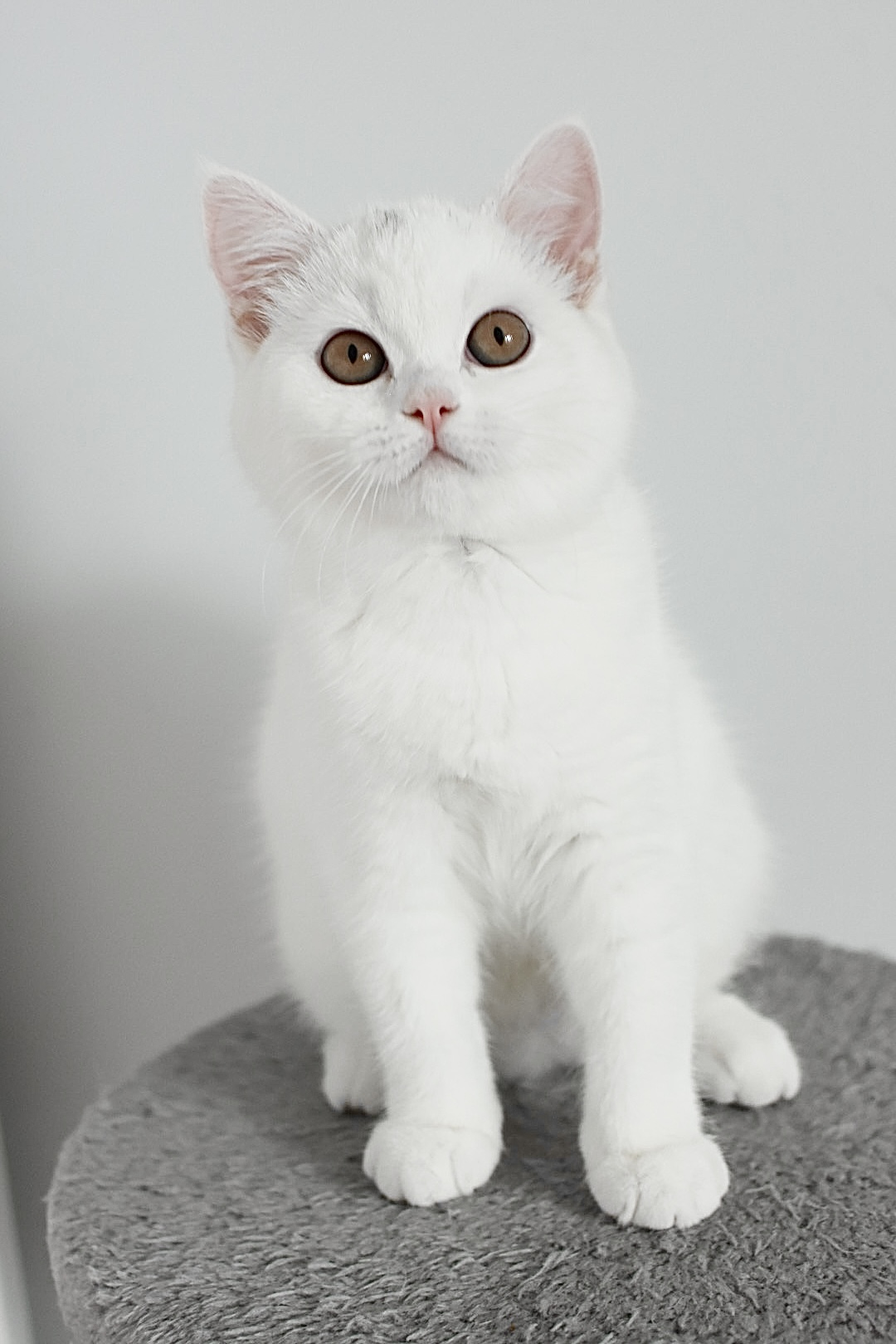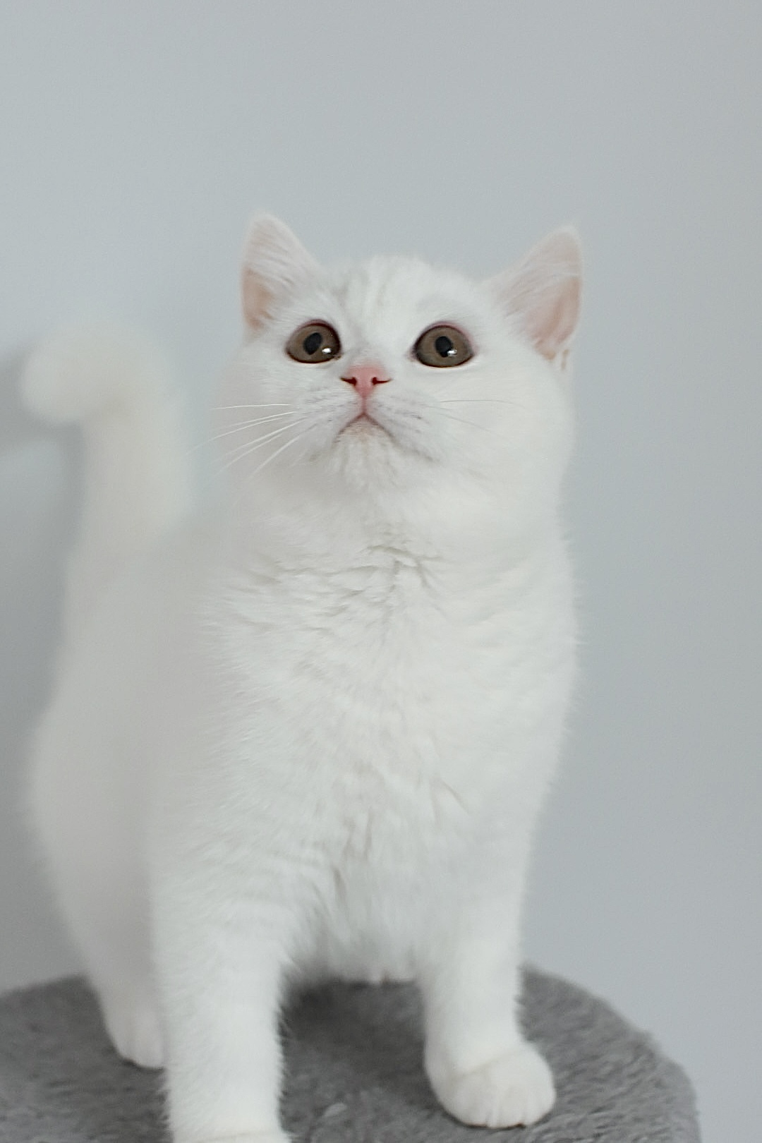 Meet the epitome of feline grace – a solid white British Shorthair kitten with the perfect balance of sophistication and sweetness.